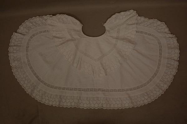 mantellina da bambina in piquet millerighe bianco, di forma ovale, con largo collo a punte. Mantellina e collo profilati da gala in merletto a ricamo meccanico tipo San Gallo, parallela alla gala una falsatura a broderie anglaise. Bottone in madreperla allo scollo.