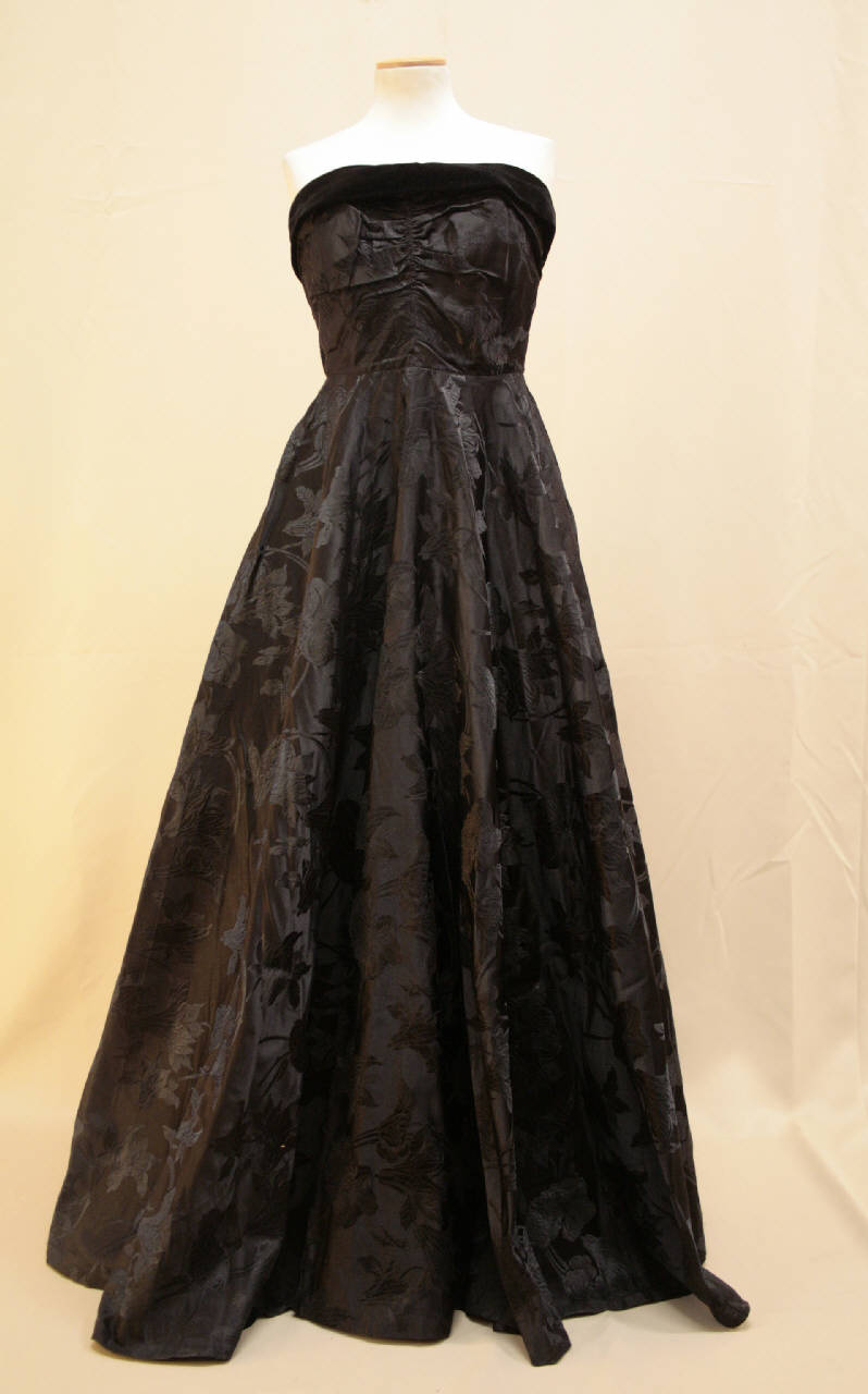 abito lungo in damasco nero a fiori tipo iris. Scollo totale diritto profilato in velluto nero. Corpino aderente, drappeggiato sul seno da arricciatura verticale centrale e pieghe laterali. Apertura posteriore centrale con automatici, ganci e cerniera nella gonna. Gonna a ruota completa. Fodera del corpino in taffetas nero. Etichetta in nastro operato con marchio, all'interno sul davanti al punto vita.