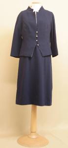 Completo composto da abito e giacca in crespo di lana blu e bianco. Abito corto, senza maniche; corpino bianco, a vita leggermente alta; scollo a barca sul davanti, sul dierto profondo e rettangolare. Bordo scollo, giromaniche e punto vita ricamati in cannette bianche e strass con motivo di piccole foglie. Gonna blu diritta. Cerniera al centro dietro. Giacca blu, collo bianco montante sul dietro e con risvolti sul davanti. Chiusa da 5 bottoni gioiello con asole. Maniche lunghe a princesse chimono. Entrambi foderati in taffetas bianco. Etichetta in nastro operato con marchio, nella giacca, sul fianco sinistro interno.