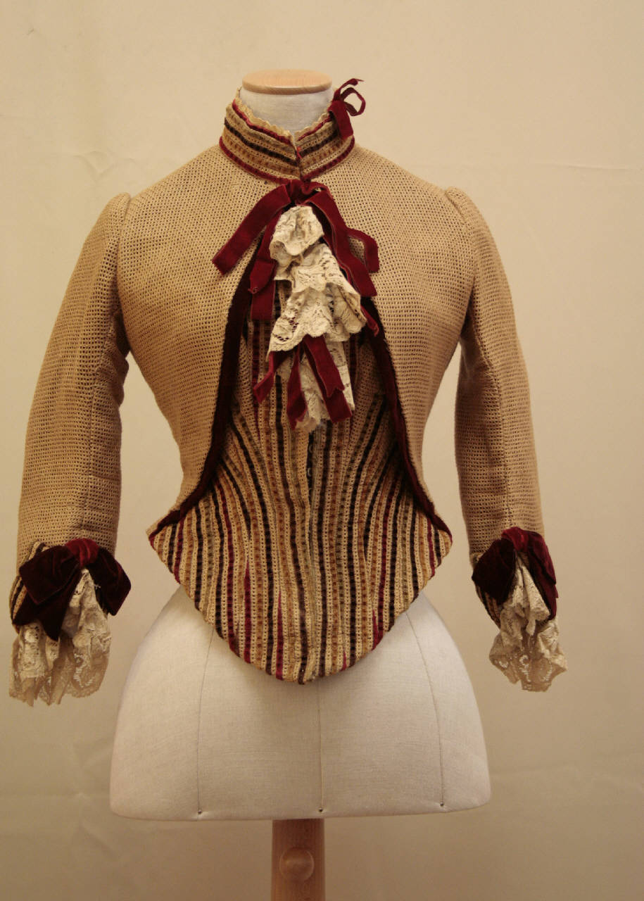 Giacca aderentecon stecche, in garza di lana nocciola e velluto cesellato rigato (fondo in garza di lana, rigature rosso, ocra, marrone e verde oliva in velluto tagliato e riccio). Bolero nocciola, profilato in velluto amaranto, accostato sul davanti su finto corpino in velluto rigato, con punta stondata che scende oltre la vita e apertura anteriore centrale con fitti ganci; nell'apertura è fermato uno jabot in merletto avorio. Collo a cinturino in velluto rigato decorato da fiocchi in velluto amarando sul davanti e presso la spalla sinistra. Dietro in 6 pezzi, di cui i 2 centrali desinenti in coda drappeggiata a finto fiocco. Maniche a 3/4 con piccolo paramani in velluto rigato, ruches in merletto e grande fiocco di velluto amaranto. Fodera in taffetas marrone.