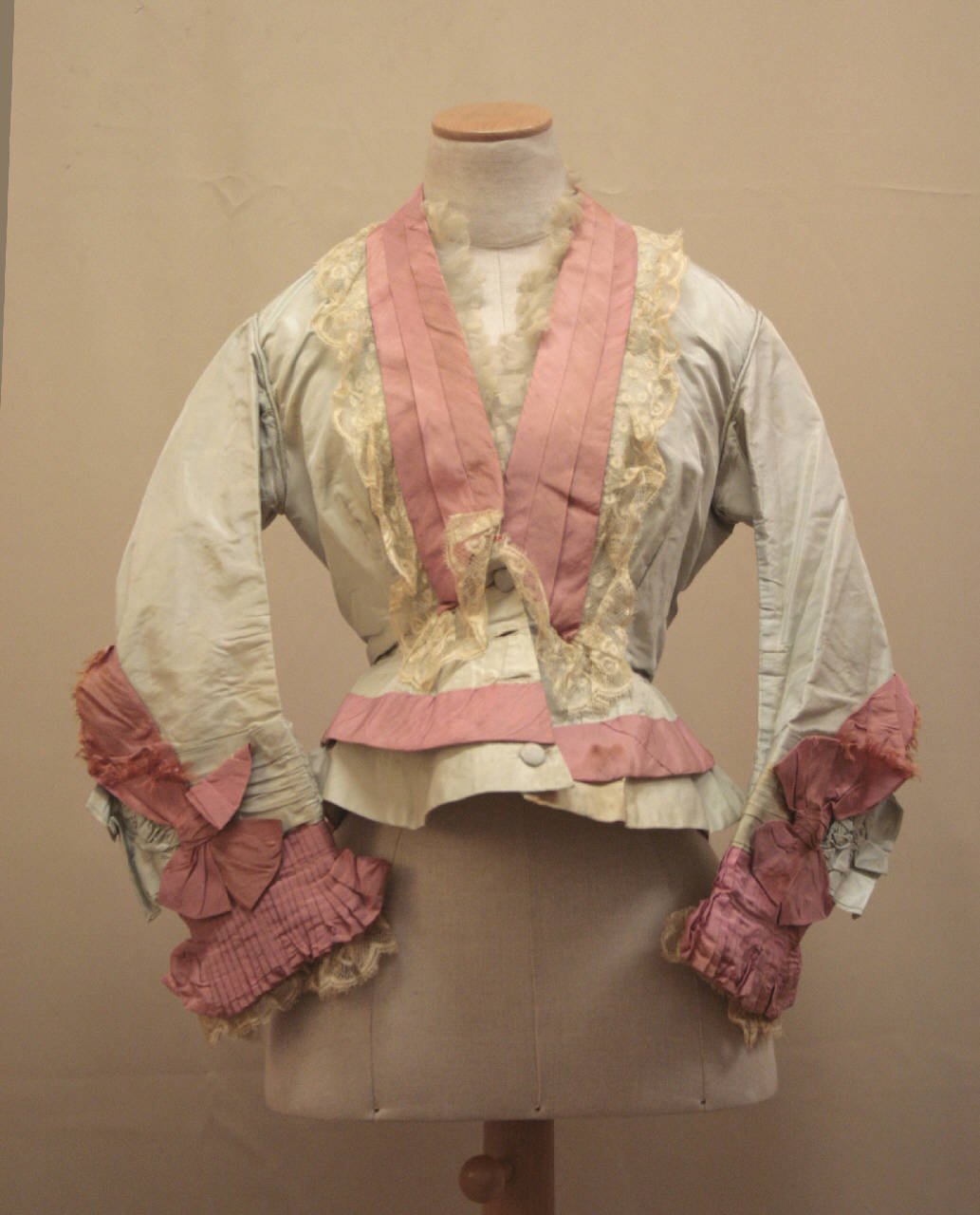 giacca lunga ai fianci, aderente in vita e svasata sui fianchi, intaffetas celeste chiaro con particolari in taffetas rosa ciclamino. Davanti in due pezzi modellati da pinces; una pences orizzontale al punto vita. dai fianchi verso il centro accentua la svasatura della parte bassa. Profondo scollo a V con collo sciallato a punte rosa, profilato da merletto avorio; all'interno dello scollo ruches in crespo avorio pieghettato. Apertura con gancio alla base del collo e bottoni rivestiti, da sotto il seno all'orlo. Dietro in 4 pezzi, con orlo stondato, profilato da banda rosa. Spalle calate, maniche lunghe, sagomate, decorate al fondo da fascia celeste a pieghe orizzontali da cui fuoriesce polsino rosa pieghettato con fiocco. All'interno del polso ruches in merletto e tulle pieghettato. Doppiata in diagonale avorio, nelle falde in taffetas avorio. All'interno nastro stringivita. La giacca è stata allargata e allungata sul davanti per adattarla ad una gestante.