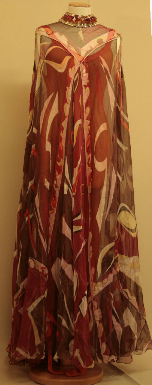Completo composto da abito lungo a tunica e busto-body con gambe. L'abito è in crespo stampato in rosso cupo, arancio, giallo e perla; senza maniche, a ruota completa formata da quattro teli con stampa a foulard, con motivi astratti entro cornice perimetrale, e inserti all'orlo per completare la circonferenza. Collo alto sul davanti, a leggera V sul dietro, doppiato in taffetas e ricoperto da grandi losanghe di strass nei colori dell'abito; chiuso dietro da ganci. All'abito è abbinato un busto-body in jersey arancio con spallini e bordo scollo in nastro grosgrain arancio. Alla sgambatura del body sono cucite le calze arancio. All'interno del collo etichetta in nastro operato con marchio.