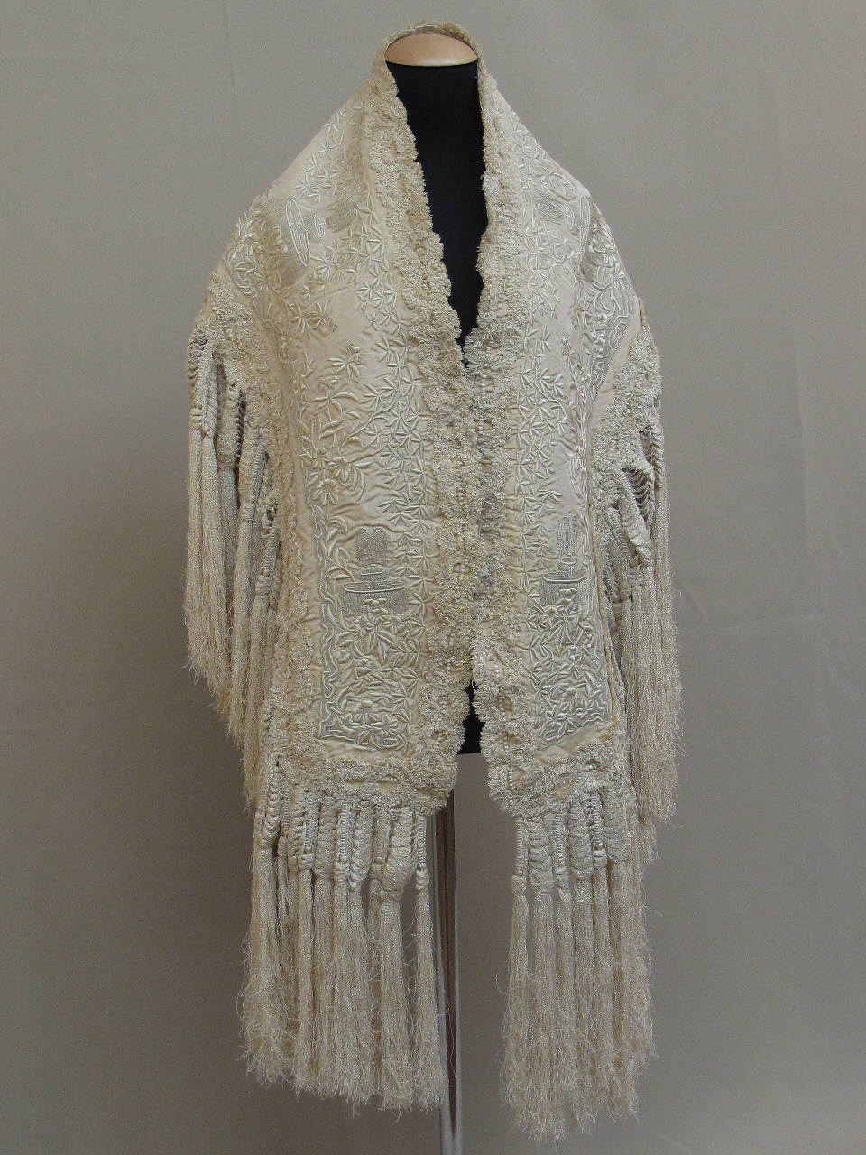 Scialle di forma allungata, in taffetas avorio fittamente ricameto in seta avorio a punto pieno imbottito, nodo, erba; raffigura il motivo della fontana zampillante, attorniata da fiori e foglie di vario tipo, di ispirazione orientale.lungo i bordi corre motivo a 8 dato da piccola frangia in seta frisè avorio. Al bordo esterno è applicata un'alta ed elaborata frangia con nappe di due tipi alternate, in seta frisè. Fodera in taffetas avorio.