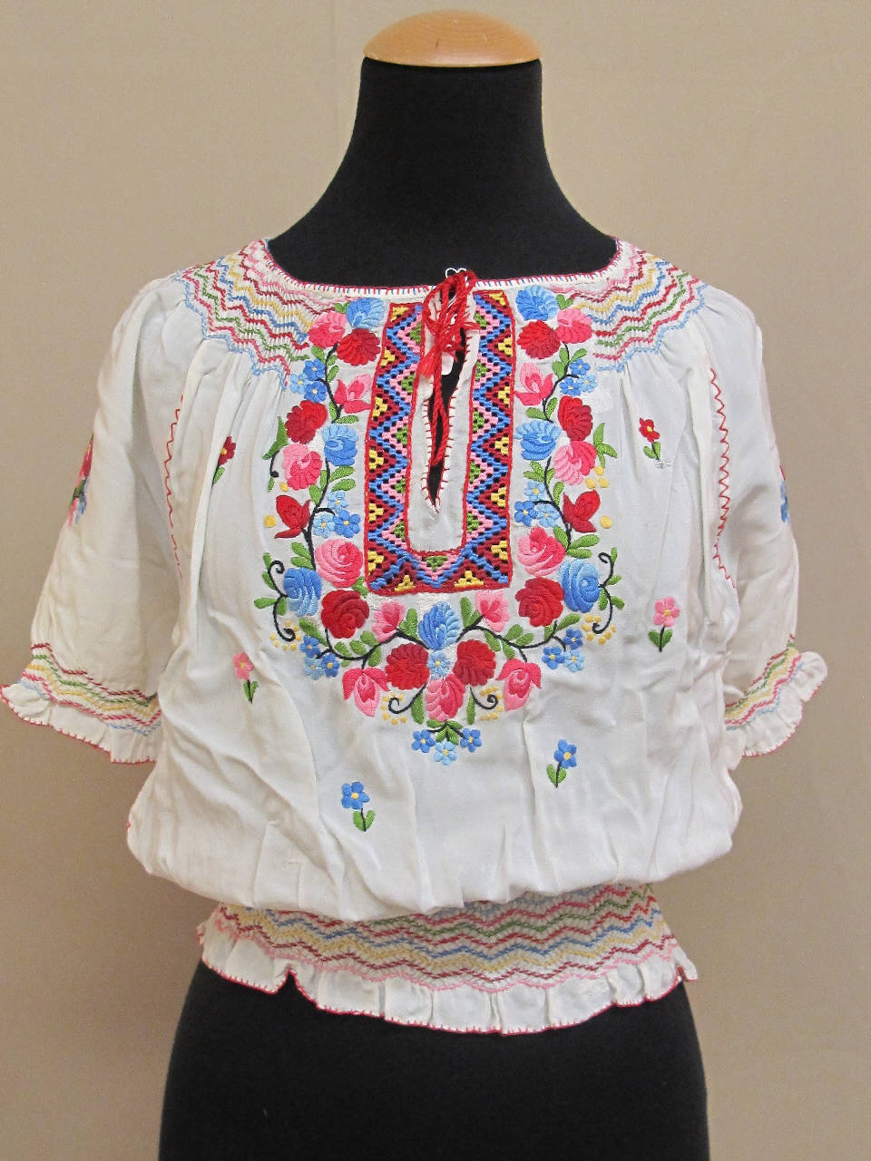 Blusa di costume popolare ungherese in crespo bianco, ricamata principalmente a punto smock e pieno con cotone policromo. Scollo rotondo con breve apertura centrale, chiuso da cordoncino rosso. Corte maniche raglan a palloncino. Bordo scollo, bordo maniche e orlo arricciati a punto smock creando rimborso. Il largo ricamo floreale in colori accesi definisce una sorta di pettorina.