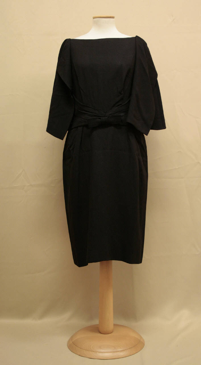 Abito corto senza maniche con finta mantellina sul davanti, in crespo nero. Scollo a barca sul davanti, a V sul dietro. Davanti con taglio in vita e pences aperte; tra il seno e la vita fascia con pieghe orizzontali, abbassata al centro da fiocco cucito. Dietro in 2 teli con pences chiuse, apertura sul fianco sinistro con cerniera. Alle spalle e lungo la parte posteriore dei giromaniche è fissata una mantellina chiusa sul davanti da bottoncino che copre le braccia fino al gomito. Fodera in taffetas nero. Etichetta in nastro operato con marchio all'interno presso la cerniera.