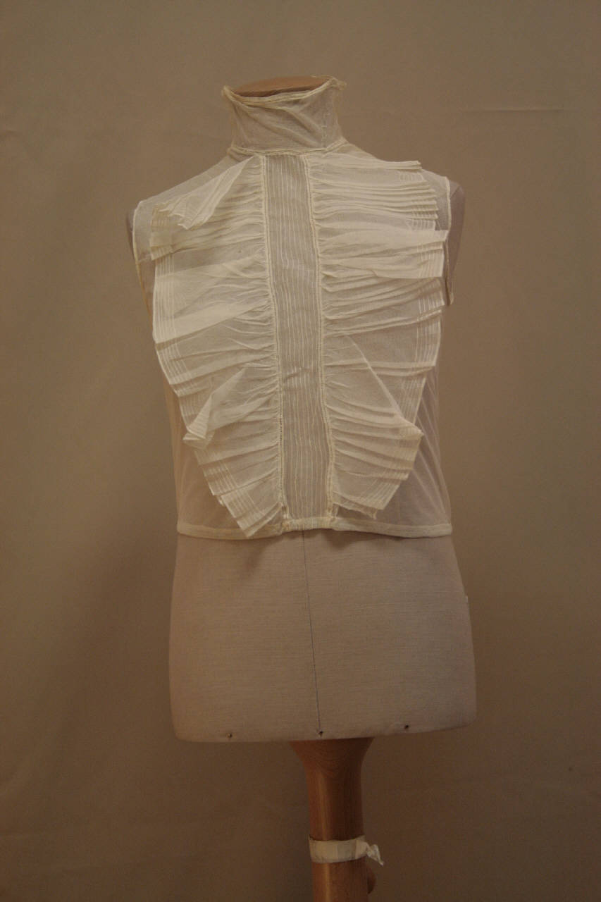 camicetta senza maniche, corta alla vita,in tulle avorio. Aderente, con stecche. Alto collo a guimpe, con stecche in metallo a serpentina, e jabot largo fino al giromaniche in tulle arricciato. Inserto centrale con rigature verticali, e piccole falsature nelle cuciture. Apertura posteriore con automatici. La camicetta aveva una funzione di sottogiacca o pettorina.