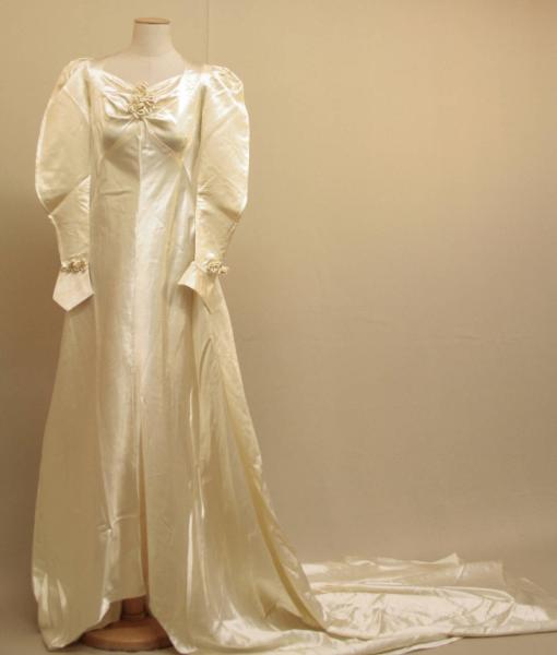 abito da sposa lungo, con strascico, a vita alta, in raso avorio. Ampio scollo a cuore sagomato da arricciatura verticale centrale decorata da fiori in tubolare di raso e carta. Tagli obliqui sotto il seno da cui partono due teli sbiechi che costituiscono la parte anteriore della gonna. Dietro a 8 teli lunghi dalle spalle all'orlo, sagomati sul dorso e con pieghe sotto la vita che ampliano il lungo strascico tondeggiante. Maniche lunghe a prosciutto, desinente al fondo ad imbuto, chiuse da automatici e decorate da fiori in tubolare. Apertura posteriore centrale con 25 fitti bottoncini rivestiti e asole in tubolare di raso.