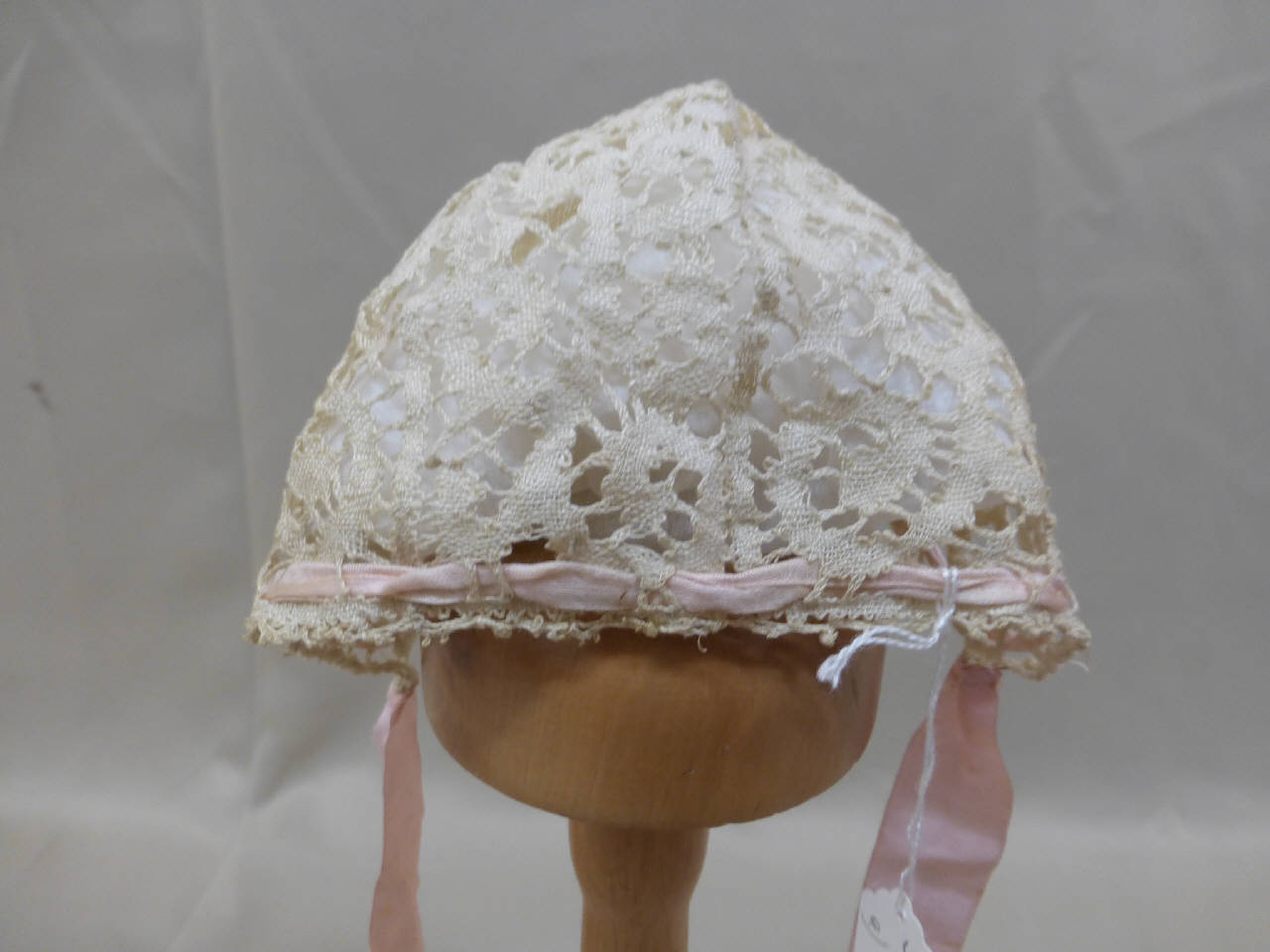 Cuffia in merletto a fuselli avorio, lavorata in un unico pezzo, con motivo a girali. Nastro in raso rosa infilato lungo il bordo inferiore, da annodare al centro dietro a coulisse. Agli angoli sono cuciti nastri rosa da annodare sotto il collo.