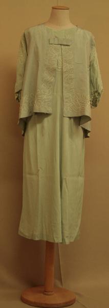 Completo formato da abito e gilè. Abito lungo sotto al polpaccio, leggermente svasato, in taffetas screziato color verde acqua ( orditi alternati bianco/ verde), ricamato a macchina nella parte alta e nelle maniche con cordoncino bianco a motivo labirintico. Piccolo scollo rotondo, maniche a chimono lunghe al gomito e strette al fondo da elastico passante in coulisse. L'ampiezza del tessuto è raccolta attorno allo scollo da fitte arricciature. Sul davanti taglio sotto il seno e al punto vita. Dietro con dorso in due pezzi, con piccole fianchette. Apertura posteriore centrale chiusa da automatici e coperta da listino con bottoncini decorativi rivestiti. Gonna in due teli, uniti in drittofilo al centro dietro e davanti in sbieco, al centro davanti due tagli simmetrici a C creano un effetto di finte tasche. Gilè girocollo nello stesso tessuto, ma in celeste chiaro. In due pezzi, uniti al centro dietro; sulle spalle sagomato da pinces attorno allo scollo. Chiuso davanti, alla base dello scollo, con finto fiocco in tessuto e automatico nascosto. Ricamo analogo all'abito lungo l'apertura e l'orlo.
