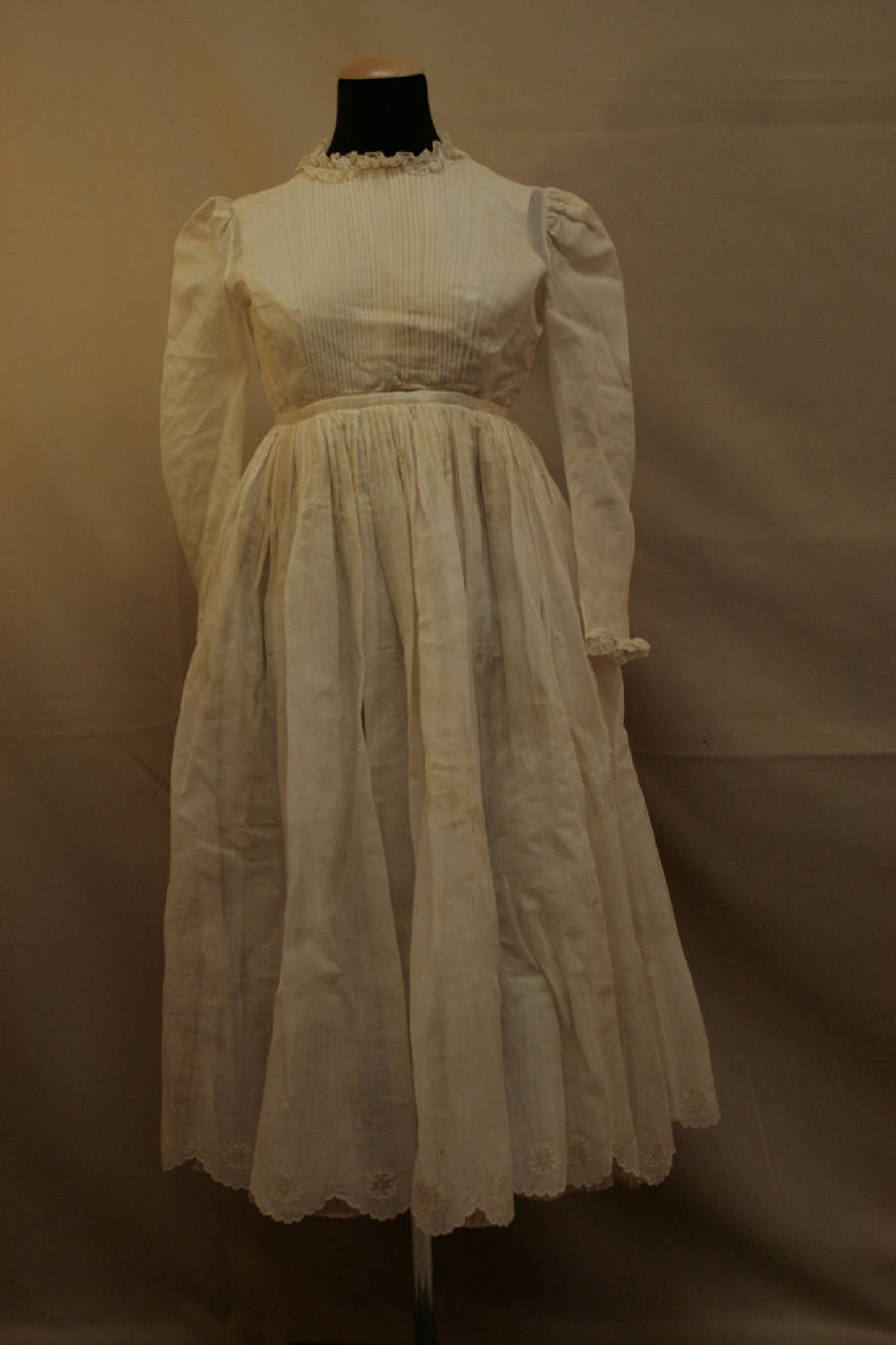 abito da Prima Comunione, corredato da velo per la testa e borsetta. Abito lungo, in leggera mussola avorio, insaldata, ricamata a macchina presso l'orlo. Corpino con scollo girocollo profilato da ruche in merletto avorio, sul davanti fitte piegoline cucite. Maniche lunghe a coprire la mano, profilate al fondo da ruche di merletto. Apertura posteriore con bottoni. Gonna a cupola, arricciata. Orlo a smerli festonati, nei quali sono inseriti piccoli medaglioni a effetto sfilato. Sottabito in raso avorio, con gonna a pieghe aperte e balza plissettata all'orlo. Velo a mezza ruota nello stesso tessuto, doppiato in piquet bianco: forma una calottina pieghettata da fermare sul capo con elastico. L'orlo del velo è rifinito come la gonna. Borsetta in mussola pieghattata, profilata da merletto e chiusa da cerniera di plastica.