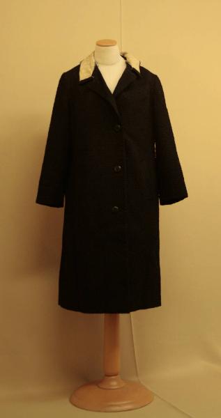 soprabito lungo sotto il ginocchio, in panno nero ricamato a macchina con cordoncino di seta che descrive motivo a labirinto. Monopetto a 4 bottoni, scollo a V e sottocollo con risvolti: il collo, forse in pelliccia, è stato asportato. Sui fianchi 2 tasche tagliate oblique con patta cucita. Fodera in taffetas sintetico.