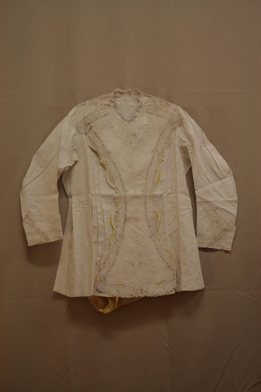 Due vestaglie matinée molto simili in tela bianca ricamata in bianco a intaglio, punto erba, pieno, filza, festone. Linea svasata, girocollo con piccola ruche; apertura centrale con bottoni nascosta da larga pettorina sovrammessa, cucita allo scollo e fermata lungo il lato sinistro da bottoncini. Maniche lunghe, con risvolto analogo alla pettorina. Le vestaglie sono inamidate, ripiegate con carta gialla sotto i ricami e fermate con spilli.