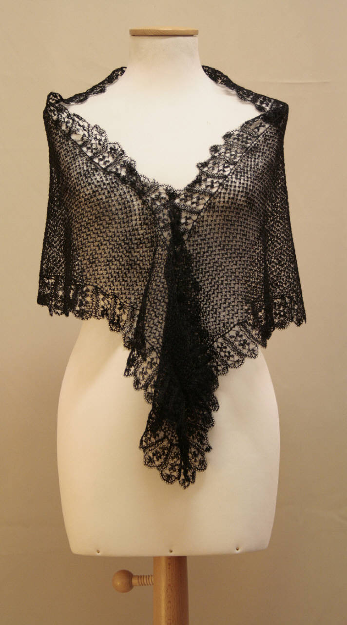 scialle rettangolare, più stretto alle estremità, in sottilissima lana-ferro nera, lavorata ad uncinetto.