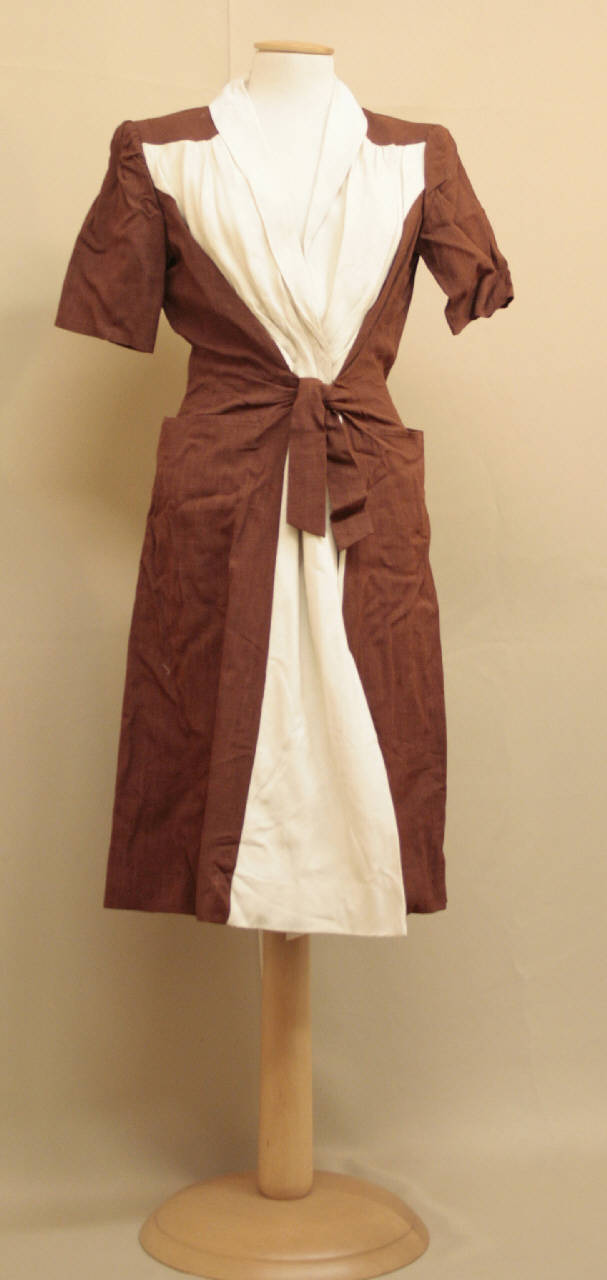 Abito lungo sotto il ginocchio, svasato, in tela di lino marrone con inserti bianchi. Apertura totale anteriore, chiusa in vita da gancio e cinturini annodati; all'interno nastro stringivita. Davanti in 4 pezzi: due marroni costituiscono i laterali, due bianchi centrali sotto lo sprone, lunghi fino all'orlo e ristretti alla vita da pieghe. I pannelli bianchi formano così due triangoli opposti, sul busto e sulla gonna. I pannelli marroni recano cinturini da annodare in vita, creando l'effetto di robe-manteau. Profondo scollo a V con collo sciallato bianco. Tasche tagliate orizzontali poco sotto la vita. Maniche corte, leggermente arricciate, con spallini imbottiti.\nDietro in due pezzi, sagomato da pinces chiuse in vita.