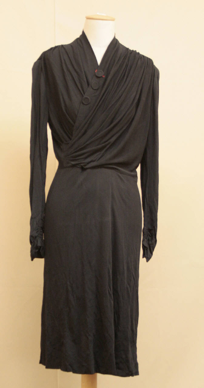 Abito lungo sotto il ginocchio, in jersey nero. Corpino con scollo a V, incrociato con fitta arricciatura sulle spalle che crea drappeggio. La sovrapposizione dell'incrocio è chiusa da 2 automatici ed è decorato con 3 bottoni rivestiti e impunturati. Al punto vita è inserita una stretta cintura che raccoglie anche l'arricciatura del dietro. Cerniera sul fianco sinistro. Maniche lunghe, aderenti,con breve arricciatura verticale al fondo. Gonna a 4 teli sul davanti, diritta e con due pences chiusa sul dietro.