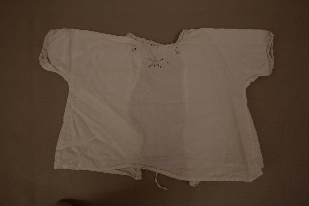 Camiciola (b) da neonato in tela bianca, modello a T, girocollo con apertura posteriore chiusa da lacci. Maniche lunghe. Scollo e polsi profilati da merletto bianco. Sul davanti alla base del collo ricamo in bianco a punto Madera, con farfalle e fiorellini.