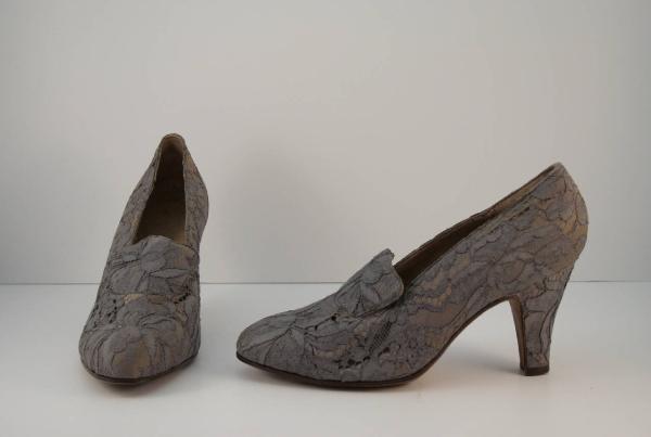 Scarpe décolleté con tomaia in un pezzo in merletto grigio piombo doppiato con raso nello stesso colore. Nella scollatura al centro davanti è inserita una linguetta sagomata a corona. Punta sfilata, tacco alto a coda, in legno ricoperto dello stesso merletto.\nFodera in pelle beige con rinforzo in pelle scamosciata nel tallone. Suoletta sostituita in panno. Suola in cuoio che si prolunga a ricoprire la gola del tacco.