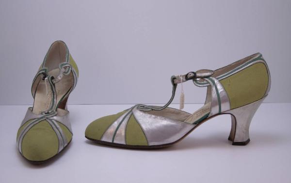 scarpe modello d'Orsay con cinturino, con mascherina e gambini in crespo verde mela e pelle argentata. Cinturino a T con fibbia in metallo e strass. Decorata da applicazioni cucite e profilature in pelle argentata e verde. Punta sfilata, tacco medio a coda, sfaccettato, in legno ricoperto di pelle argentata. Fodera e suoletta in pelle bianca. Suola in cuoio che si prolunga a ricoprire la gola del tacco.\nTimbro dorato nella suoletta riportante "Bentivégna Perugia - 11 Faub. St. Honoré - Paris"\nEtichetta in nastro operato inserita all'interno "Modele deposé N°5371 pre.2847"