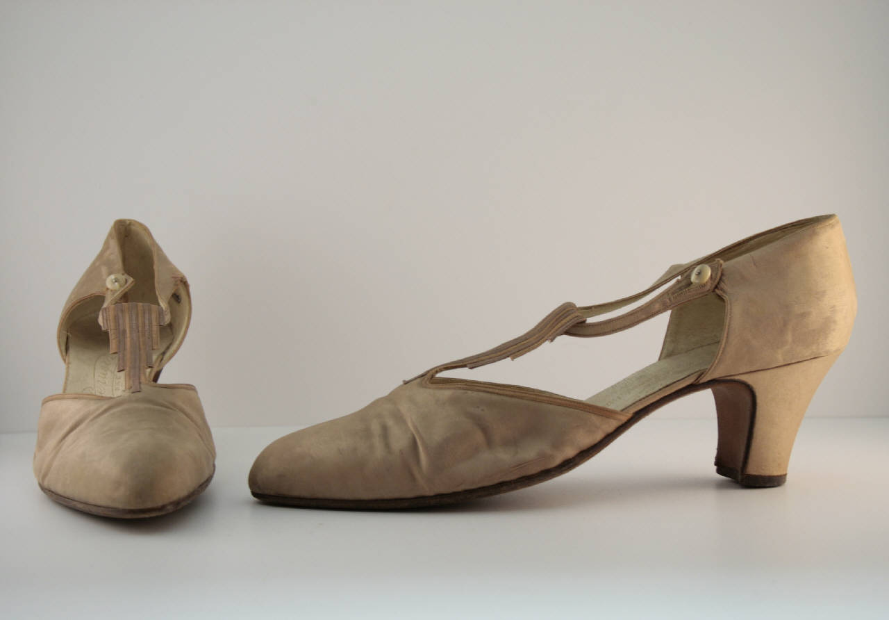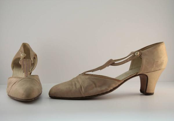 scarpe modello d'Orsay con cinturino, in raso color cipria e profili in pelle rosata. Cinturino a T in louisine avorio, con passante in pelle a sottili righe in due toni di rosa, chiuso da bottone in madreperla. Punta sfilata, tacco medio in legno, a coda, ricoperto dallo stesso tessuto; bordino argentato al sottotacco. Fodera e suoletta in pelle bianca (capretto?); nella mascherina in tela bianca. Suola in cuoio che si prolunga a ricoprire la gola del tacco.\nNella suoletta timbro dorato riportante "Perugia - B.te SGDG NICE 11 Faub.g St. Honoré - PARIS".\nEtichetta in nastro operato inserita all'interno "Modele deposé N°17088 pre. 86881 Made in France"