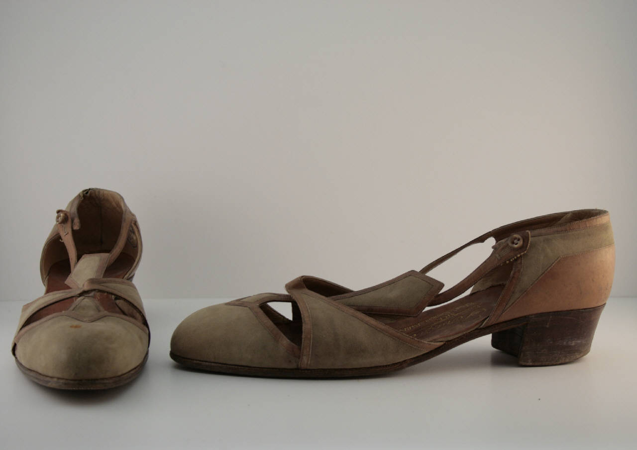 scarpe modello d'Orsay con cinturino, in pelle scamosciata nocciola, profilata e decorata da listini in pelle color cuoio. Mascherina in due parti: punta e fascia separata a triangoli contrapposti. Cinturino a T con lungo passante verticale a forma di trangoli contrapposti che parte dalla punta e passa sotto la fascia; chiuso da bottone di madreperla.\nPunta rotonda, tacco basso a strati di cuoio. Fodera in pelle beige, suoletta in cuoio. Suola in cuoio con piccolo guardolo.\nNella suoletta timbro dorato riportante "Perugia - B.te SGDG NICE 11 Faub.g St. Honoré - PARIS". \nSulle suole è impresso "Bentivegna".\nEtichetta in nastro operato inserita all'interno "Modele deposé Bentivegna N° 3594 pre. 1414"