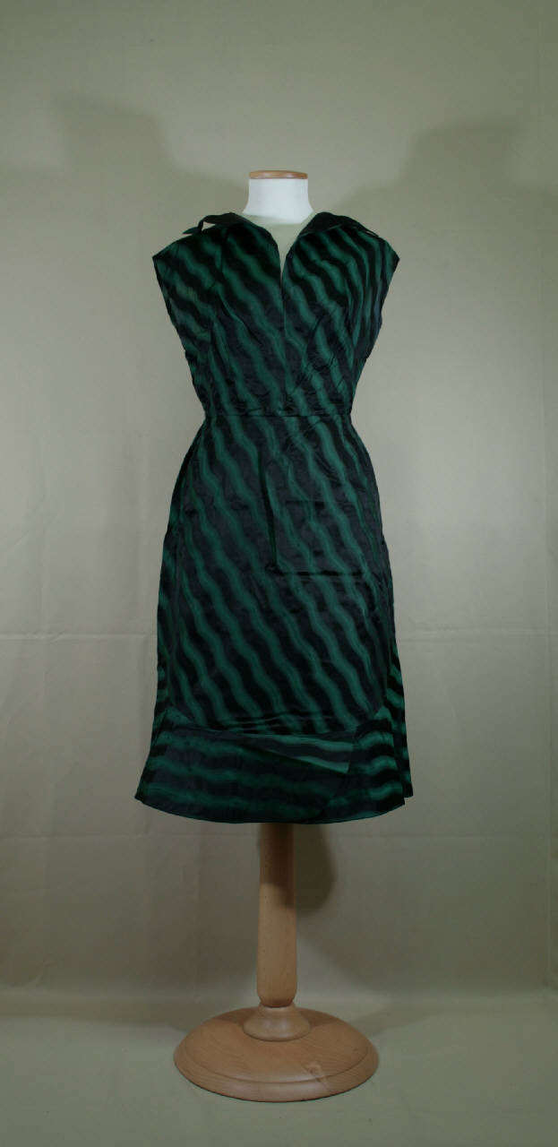 abito senza maniche, lungo sotto il ginocchio, in pekin (raso faccia ordito, diagonale, taffetas, diagonale, raso faccia trama; ordito nero, trama verde) con motivo a bande ondulanti diagonali verde e nero. Corpino aderente, sagomato da pinces; scollo a V con risvolti doppiati in raso nero davanti e dietro. Spalle scese con accenno di aletta a chimono. Apertura al centro dietro con cerniera.\nGonna svasata, con stretto telo posteriore che all'orlo si prolunga sul davanti formando in basso banda in sbieco.\nCoprino doppiato in tulle avorio; gonna doppiata in rigida tela avorio.