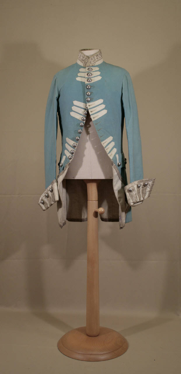 marsina lunga sotto i fianchi in panno celeste, con collo, paramani e interno delle falde in panno avorio, decorata con galloni argentati e bottoni semisferici in metallo color argento. Mostre decorate da 3 gruppi di fini alamari in panno avorio. Collo a cinturino, mostre stondate con 15 bottoni e occhielli corrispondenti dallo scollo a sotto la vita. Taglio in vita, falde diritte con angoli anteriori e posteriori ripiegati all'esterno e fermati da bottone. Patte decorative con finti alamari e 3 bottoni. Dorso ampio, falde posteriori con finte pieghe laterali dove sono inserite le tasche; spacco centrale sovrapposto. MAniche lunghe, diritte, con paramani avorio con finti alamari dati dal gallone e 3 bottoni. Doppiata in panno avorio, fodera di dorso e maniche in tela naturale.
