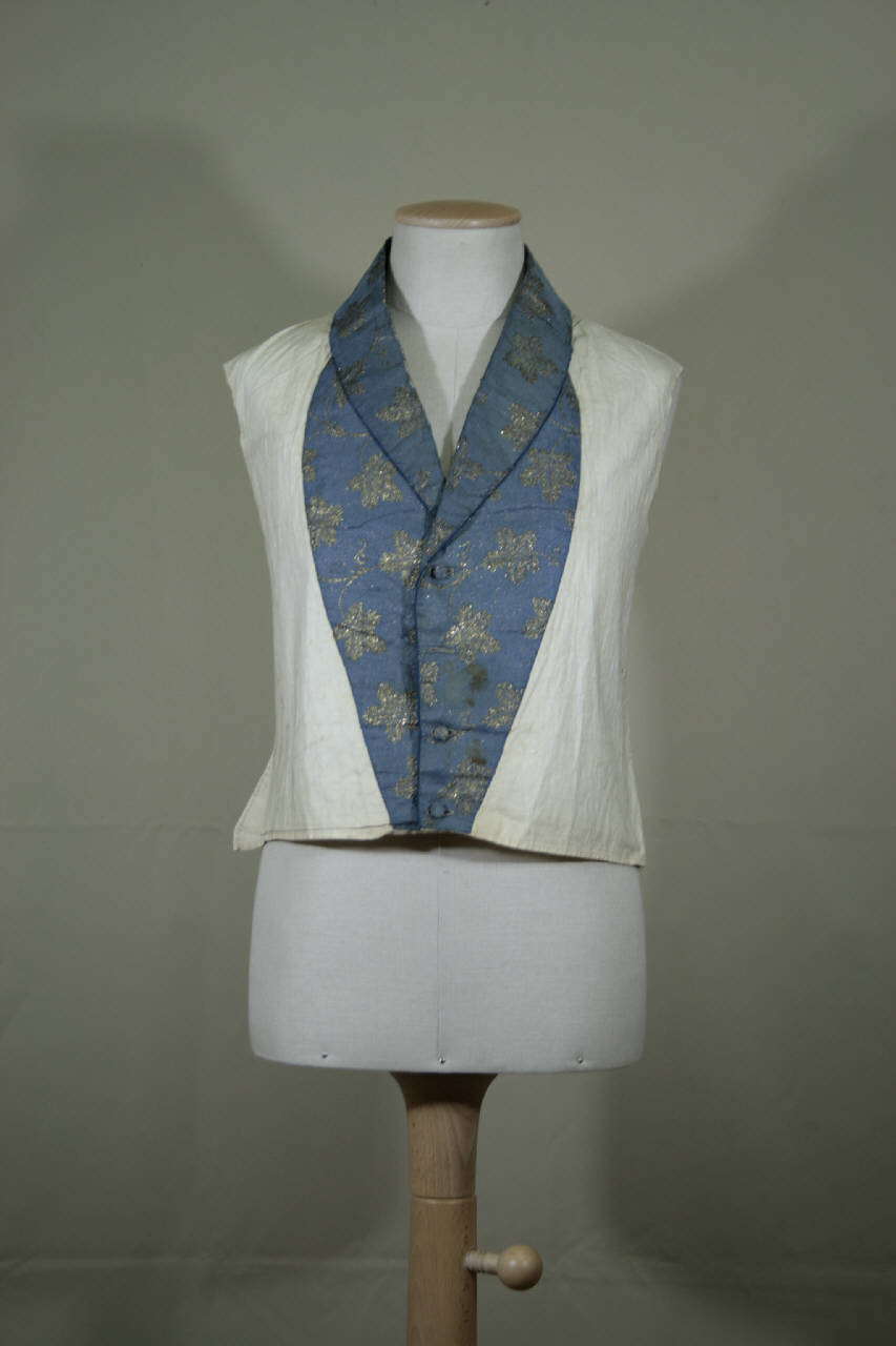 sottogilè monopetto corto in vita, con collo e zone ai lati dell'apertura in taffetas operato lanciato, a fondo azzurro carta da zucchero e decoro dorato a tralci di vite con foglie. Scollo a V con collo a scialle; apertura a 4 bottoni rivestiti e occhielli corripsondenti. Collo e apertura profilati da nervatura in taffetas blu. Quarti anteriori e spalle in tela di cotone bianca; dorso perduto.