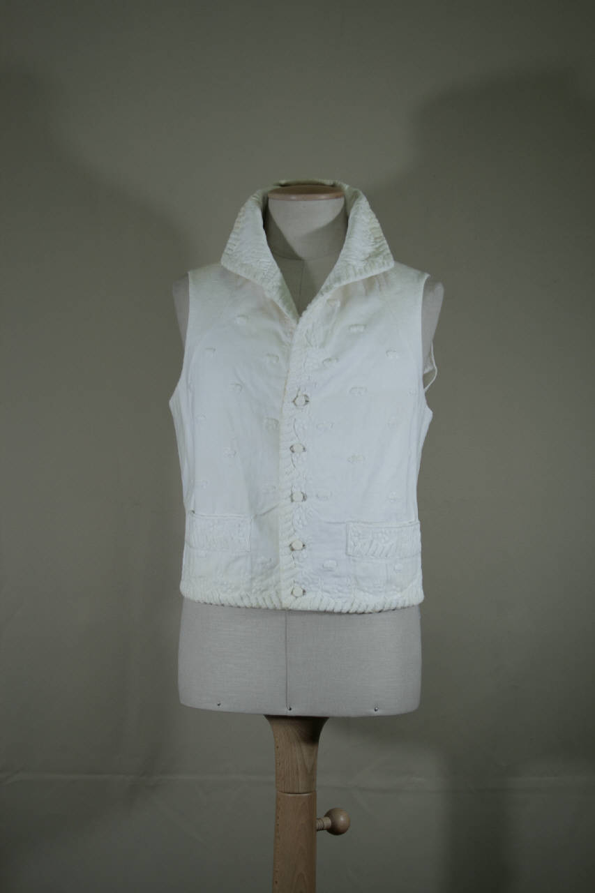 Gilè corto in vita in diagonale bianco, ricamato con cotone bianco a punto erba e pieno e punti tagliati ad effetto velluto; motivo a barrette oblique vellutate lungo i bordi, affiancato da fiorellini e foglie; motivi sparsi stilizzati. Alto collo a cinturino (cm8,5), mostre diritte chiuse da 5 bottoni e occhielli corrispondenti dal petto al fondo; diritto al fondo, piccole patte cucite. Dorso in tela bianca, regolabile con coppia di lacci.\nFodera di collo e quarti anteriori in tela bianca.
