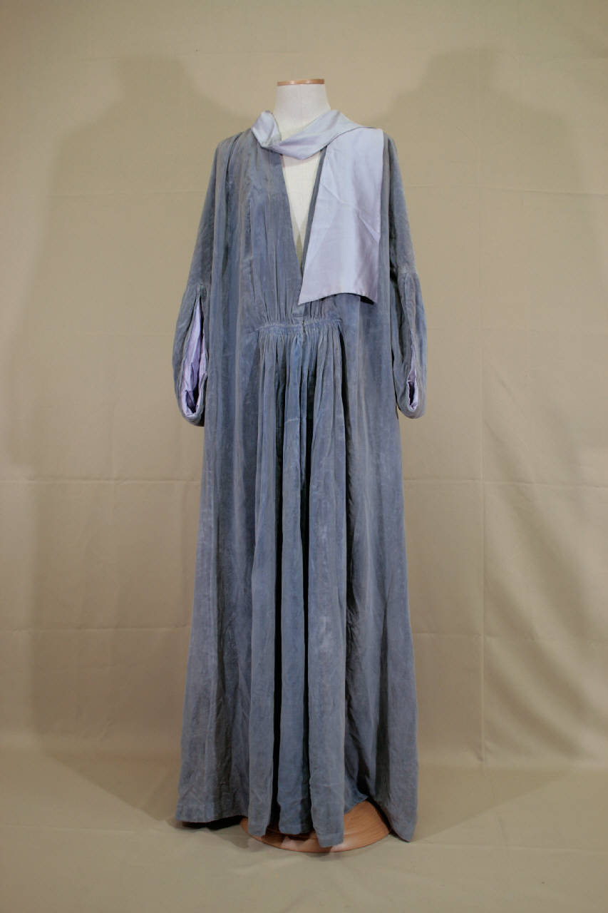 Vestaglia lunga in velluto celeste polvere. Di linea ampia, con scollo a V profondo fino in vita; increspature lungo le spalle e al punto vita, al centro davanti. Al punto vita è chiusa da 2 ganci, dalla vita in giù da cerniera e poi cucita (cerniera e cucitura sono intervento successivo). Maniche fantasia, a chimono sul dietro, raglan davanti, lunghe fino al gomito e terminanti con drappeggio a goccia. Fodera in raso viola. Abbinata fusciacca in raso viola. \nEtichetta all'interno, al centro dietro, in nastro operato riportante "Ventura Milano Roma" e logo ditta.