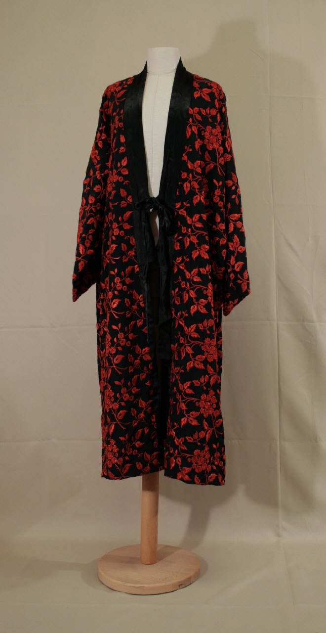 Vestaglia chimono in crespo pesante nero, ricamato a macchina in cotone o viscosa arancio corallo, con motivo a piccoli rami fioriti. Maniche ampie, aperte nella parte anteriore dei giromaniche. Lungo collo a scialle in raso nero; due cinturini da annodare fissati alla base dello scollo. Apertura anteriore non sovrapponibile.