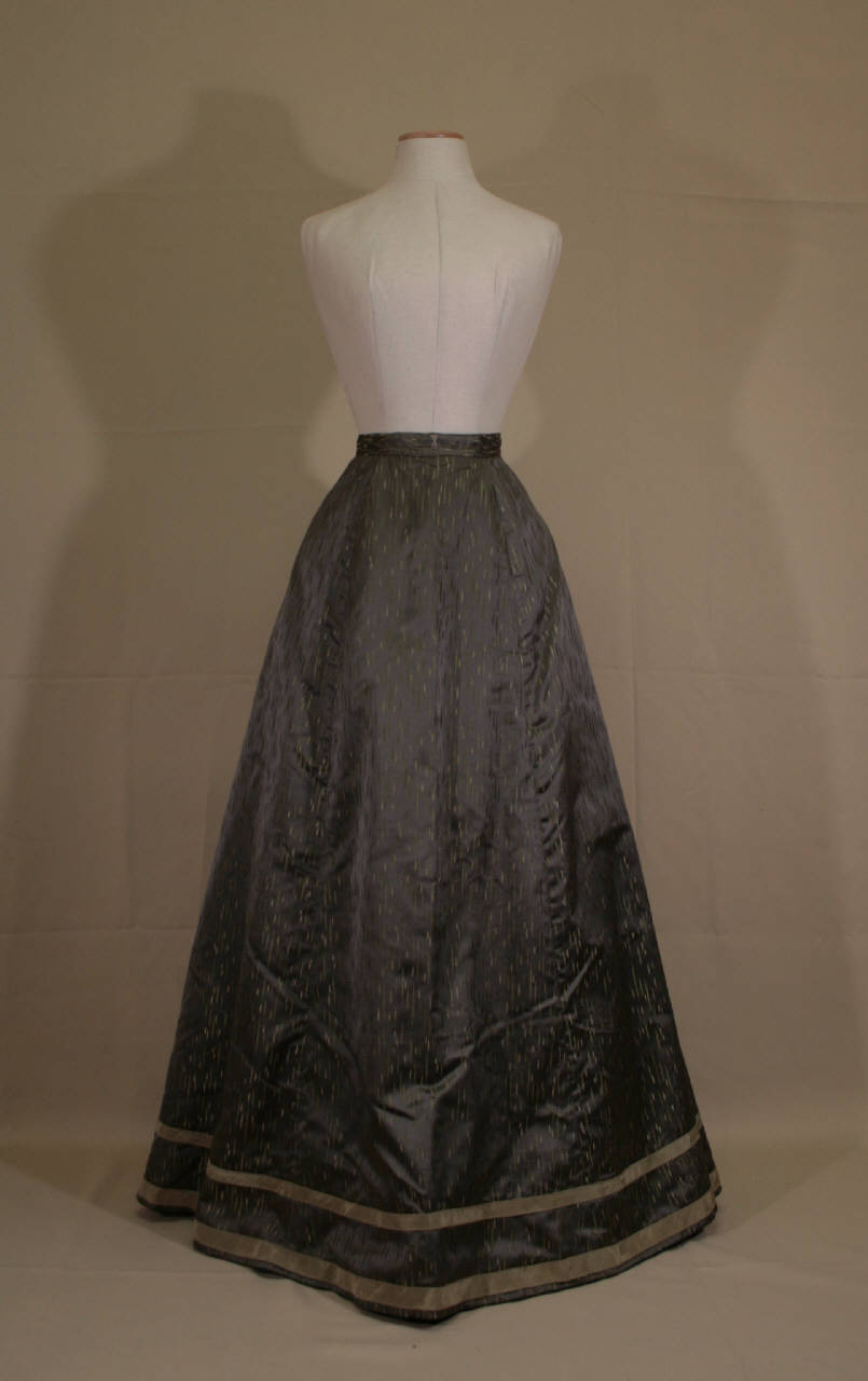 Gonna lunga asimmetrica in raso cangiante operato liseré (ordito verde salvia, trama alternata verde e verde chiaro), con fondo verde salvia e decoro a piccoli motivi verticali a fitto zig-zag a diverse lunghezze in verde e verde chiaro. Formata da 5 teli, con gheroni nei 4 teli laterali e posteriori; stretti in vita da cintura nello stesso tessuto. Al centro dietro piega a cannone che nasconde l'apertura, chiusa da ganci in vita. Presso l'orlo due giri di nastro in gros marezzato nocciola. Rinforzo interno all'orlo in taffetas cangiante grigio-verde e balayeuse a nervatura verde scuro. Sottogonna in taffetas cangiante (ordito giallo trama verde) cucita alla vita; all'orlo alto rinforzo in materiale rigido, piccola ruche arricciata tagliata al vivo a zig-zag e balayeuse in lana grigia a frangia. Nell'apertura della gonna è inserita una tasca a sacchetto. All'interno, sul dietro, elastico per trattenere sul retro l'ampiezza della gonna.