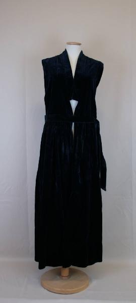 Abito senza maniche, lungo alla caviglia, in velluto tagliato blu notte. Corpino davanti in due pezzi, con due pieghe sulle spalle; dietro in un pezzo. Lungo collo sciallato. Aperto al centro davanti, e sui fianchi, dal giromaniche fin sopra le ginocchia, senza sistema di chiusura. Gonna con davanti in due teli, dietro in uno; pieghe fermate lungo la vita. Cintura nello stesso tessuto; tracce di decorazione in pelle, ora perduta, ad una delle estremità della cintura. Cuciture protette internamente da nastrino con margini profilati dallo stesso nastrino.
