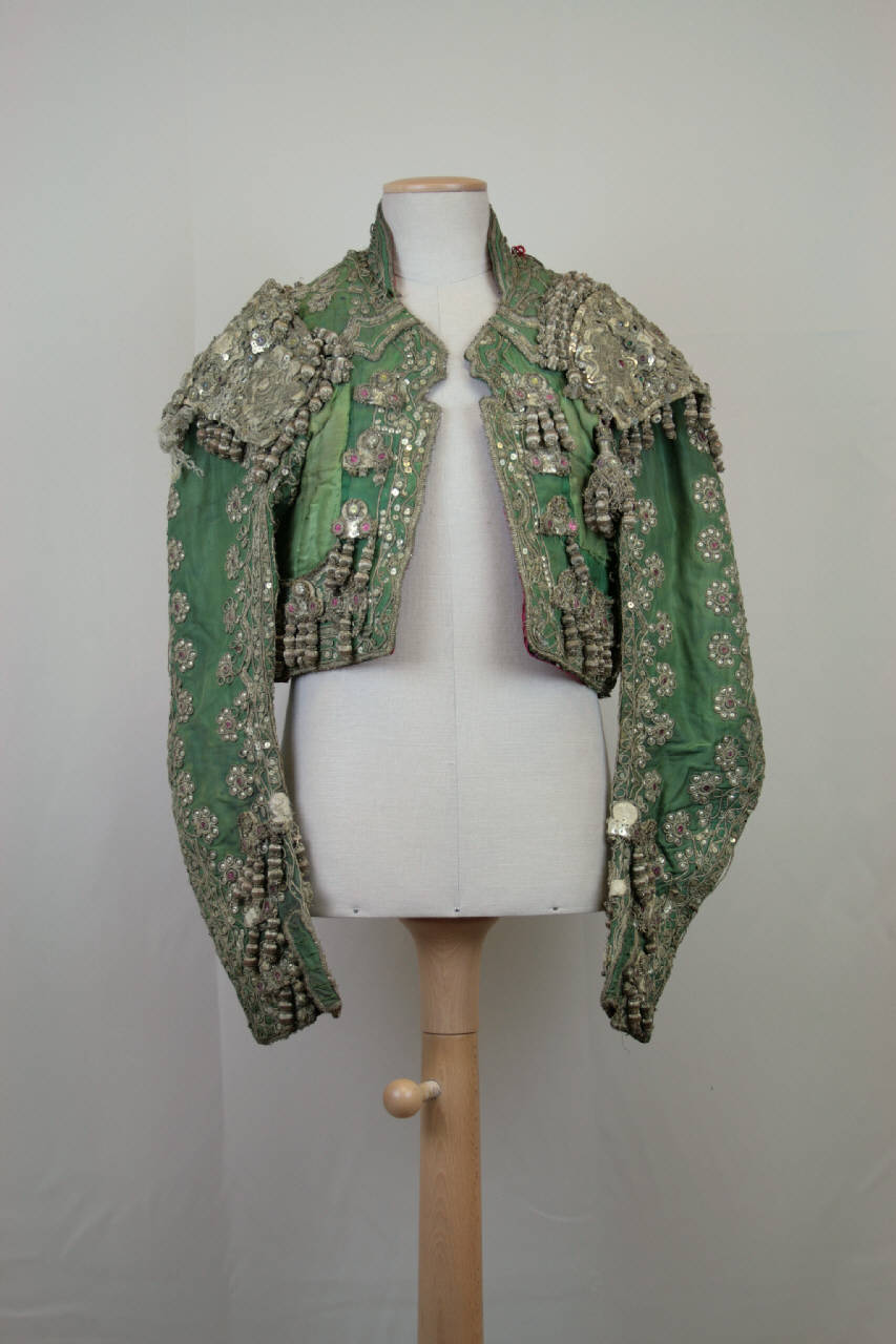 Giacca bolero (chaquetilla) in taffetas effetto gros verde; fittamente ricamata con cordoncino, paillettes e canutiglia argento e lustrini rossi. Motivo a cornici floreali stilizzate con corolle con cuore rosso che percorrono le cuciture di confezione. Sulle spalle ampie spalline (hombreras) lavorate a parte e applicate, in tessuto laminato argento ricoperto da rete ad ago su cui sono applicate fitte stelle decorate da paillettes; le spalline sono profilate da fitte jasmine argento pendenti. Sul davanti e sul dietro due grandi nappe argento.\nCollo a cinturino, aperture diritte senza sistema di chiusura decorate da coppie di alamari argento; due taschini con patta sagomata e fodera in raso color salmone. Maniche molto lunghe, aderenti, in due pezzi sagomate, con spacco al fondo chiuso da 6 bottoni argento ricoperti ad ago (dei quali perduti 2 a destra e 1 a sinistra) con occhielli corrispondenti. Dorso ampio.\nControfodera interna, fodera originale in raso color salmone ricoperta da ulteriore fodera in tafftetas rosso. Fodera di dorso e maniche in tela bianca. Sulla fodera, presso l'apertura, è sommariamente ricamato il numero 908.