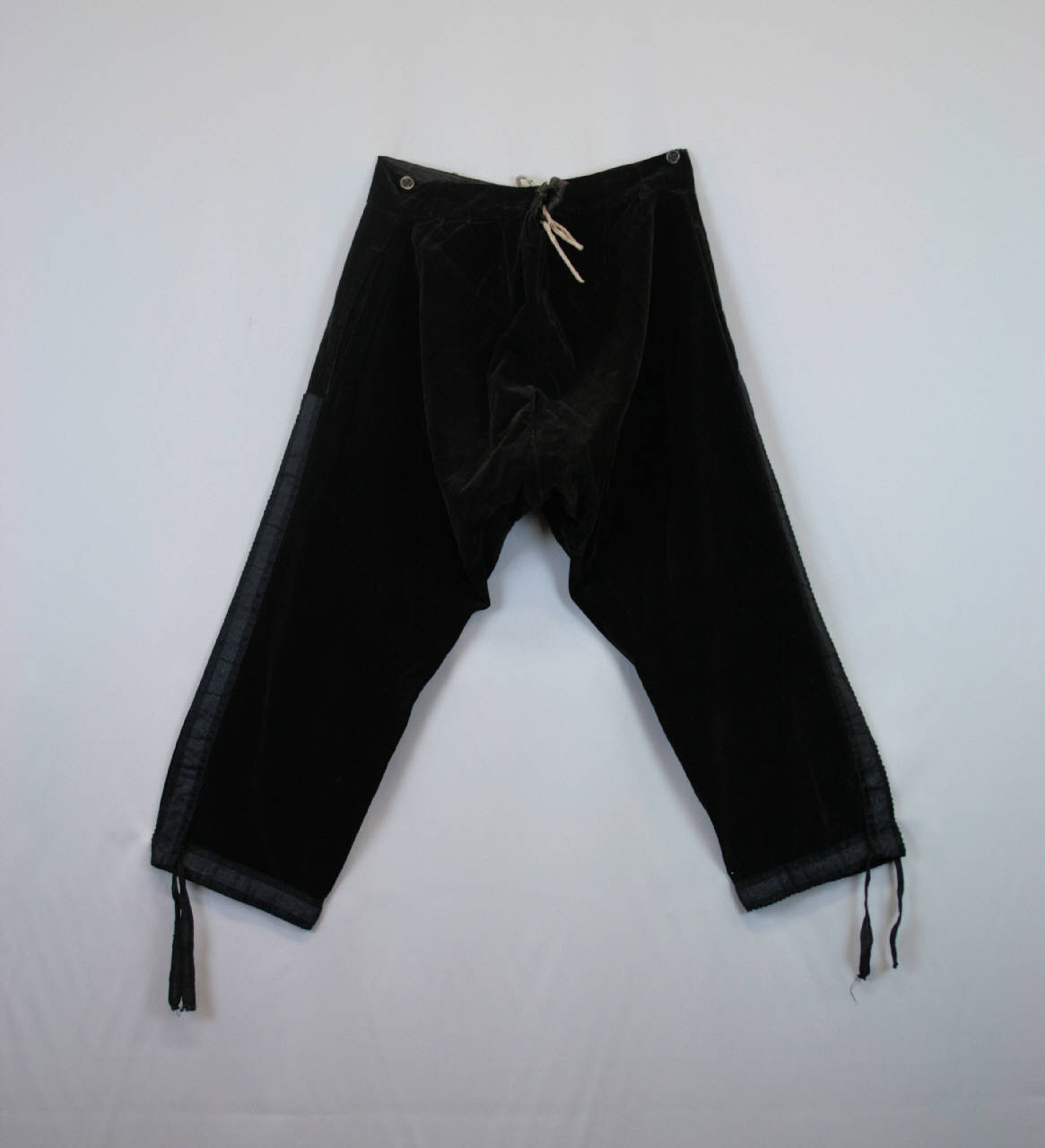 Calzoni confezionati in velluto marrone scuro. Alta cintura chiusa davanti con 2 bottoni; sul dietro regolabili con fettuccia e 4 occhielli tondi.\nPatta verticale a 2 bottoni; coppie di pences aperte sul davanti. Gambe aderenti, con spacco al fondo chiuso da fettucce da annodare. Sulle cuciture dei fianchi e al fondo è applicato un gallone in gros marezzato nero.\nFodera in tela marrone.