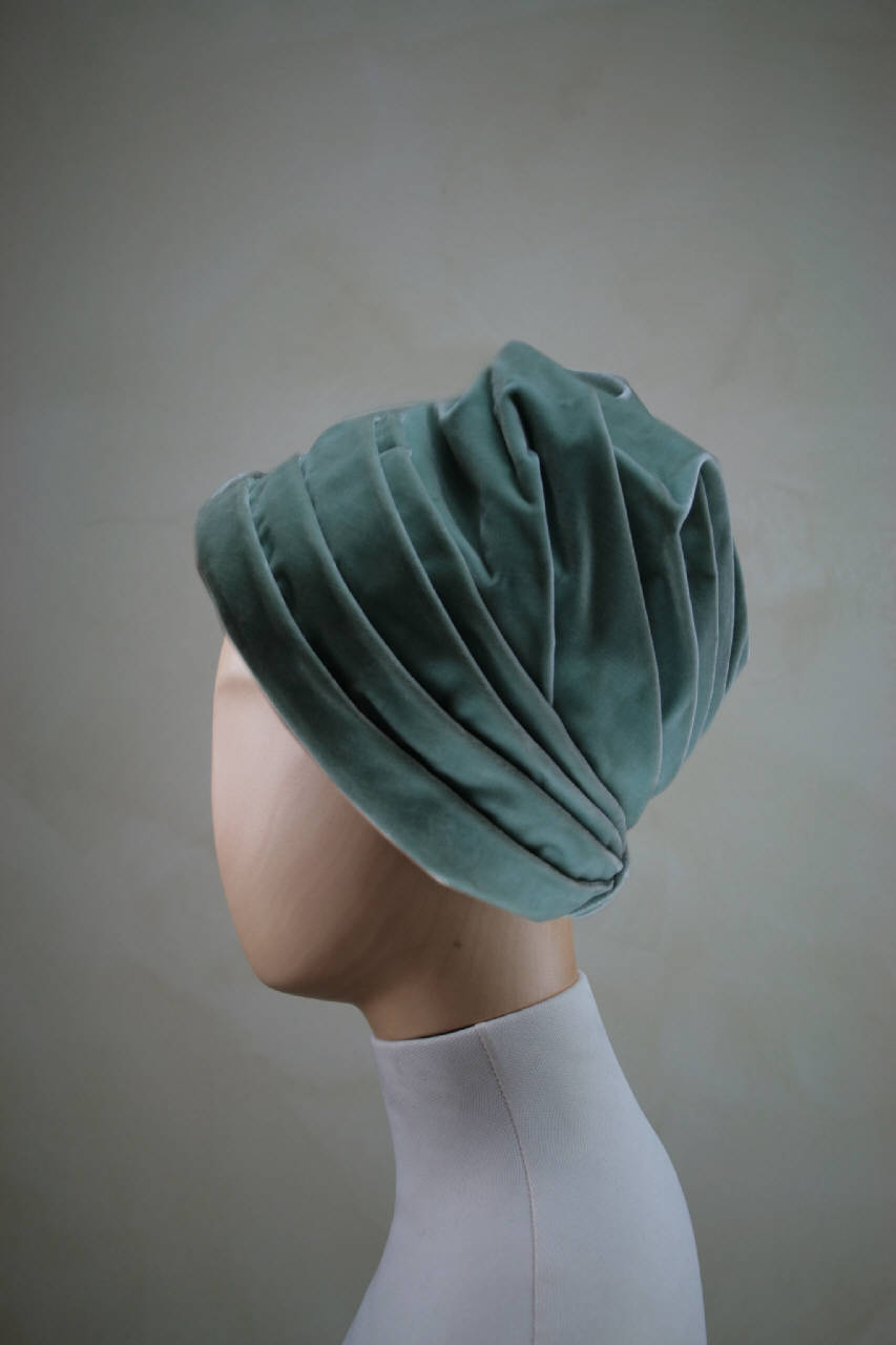 Cappello a finto turbante in velluto verde acqua, modellato da pieghe irregolari, riunite dietro a spina di pesce e fermate da passante. All'interno, nella parte bassa, supporto in tulle rigido; giro d'entrata in gros marrone.