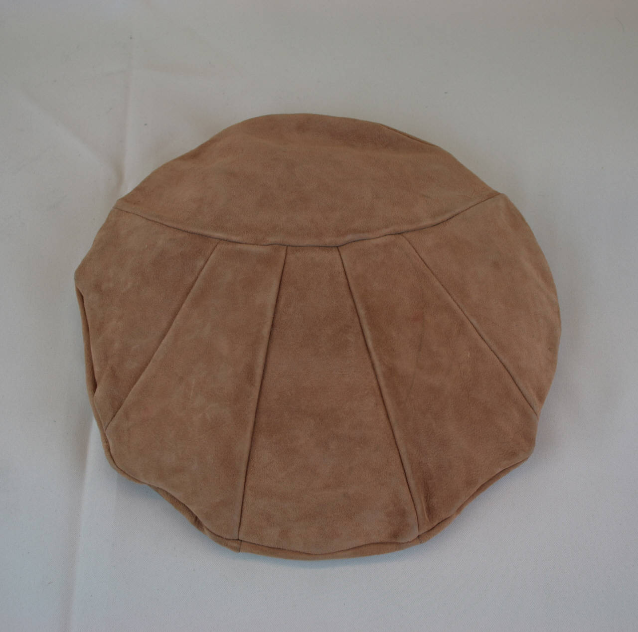 Basco in pelle scamosciata nocciola. Piatto superiore a spicchi cuciti tra loro con motivo asimmetrico a raggiera; il piatto inferiore è a spicchi come il superiore ed è cucito ad esso lungo il profilo. Giro d'entrata in pelle avorio. All'interno etichetta in nastro operato riproducente bandiera tricolore con iniziali del produttore.