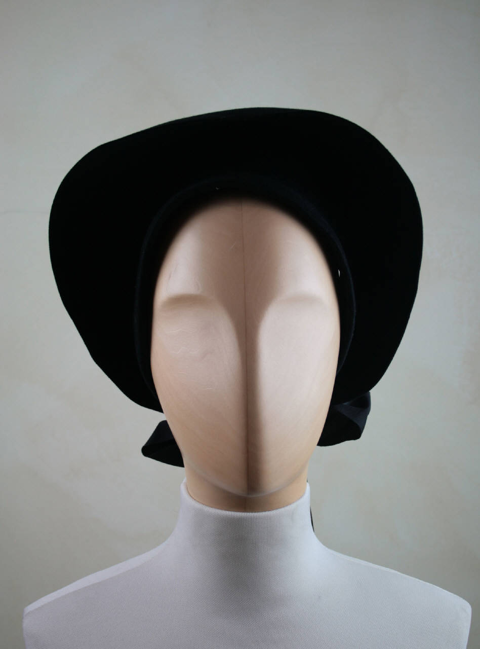 cappello a toque senza calotta, in feltro nero. Alta fascia con falda cucita al bordo superiore e risvoltata verso il basso, chiusa ad anello da alto nastro gros nero annodato dietro con fiocco. Giro d'entrata in gros nero. All'interno etichetta in nastro stampato.