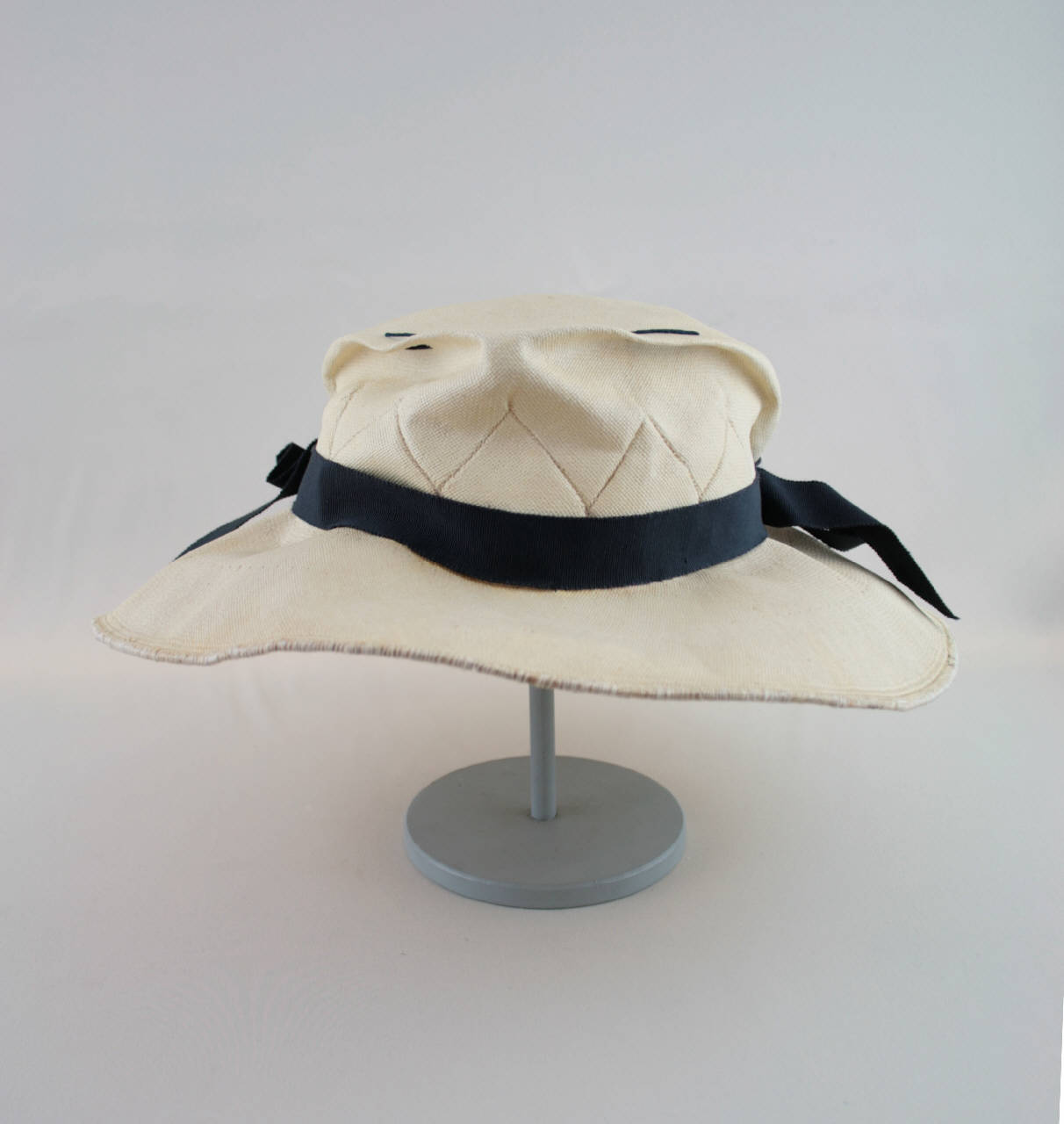 Cappello ispirato al panama, con tesa ampia in paglia bianca. Calotta alta, decorata con nervature a zig-zag alla base e due pieghe orizzontali presso la cima, fermate da cordoncino blu, che formano punta sul davanti. Cinta in nastro gros blu con nodi sui due lati. Tesa circolare con ferrino nel bordo. Giro d'entrata in nastro gros blu. All'interno etichetta in nastro stampato.