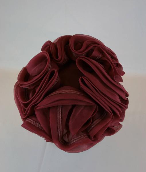 Toque in crespo rosso mattone. La calotta è ricoperta da alta ruche doppia che forma fitte volute, in crespo decorato da treccina di paglia in tinta. Supporto interno in strati di tulle blu, giro d'entrata ripiegato all'interno, con ferrino, profilato da nastro gros rosso. All'interno etichetta in nastro operato.