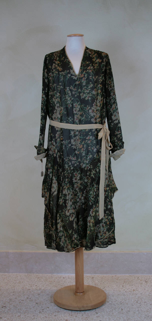 Abito a tunica, lungo al polpaccio, in crespo marrone con trama lanciata dorata che descrive minuti rombi, stampato con motivo di fasci di fiori bianchi, gialli e rossi tipo narcisi. Scollo a V; arricciatura sulle spalle raccolta sui fianchi da gruppo di pinces. Lateralmente, sotto i fianchi, sono applicate due balze simmetriche sbieche che formano motivo a punta verso l'orlo, sul davanti e sul dietro Maniche lunghe, morbide, con polsino chiuso da 1 bottone, con aletta sbieca; polsino e aletta doppiati in crespo nocciola. Cinturina a nastro, a due giri, in crespo nocciola.