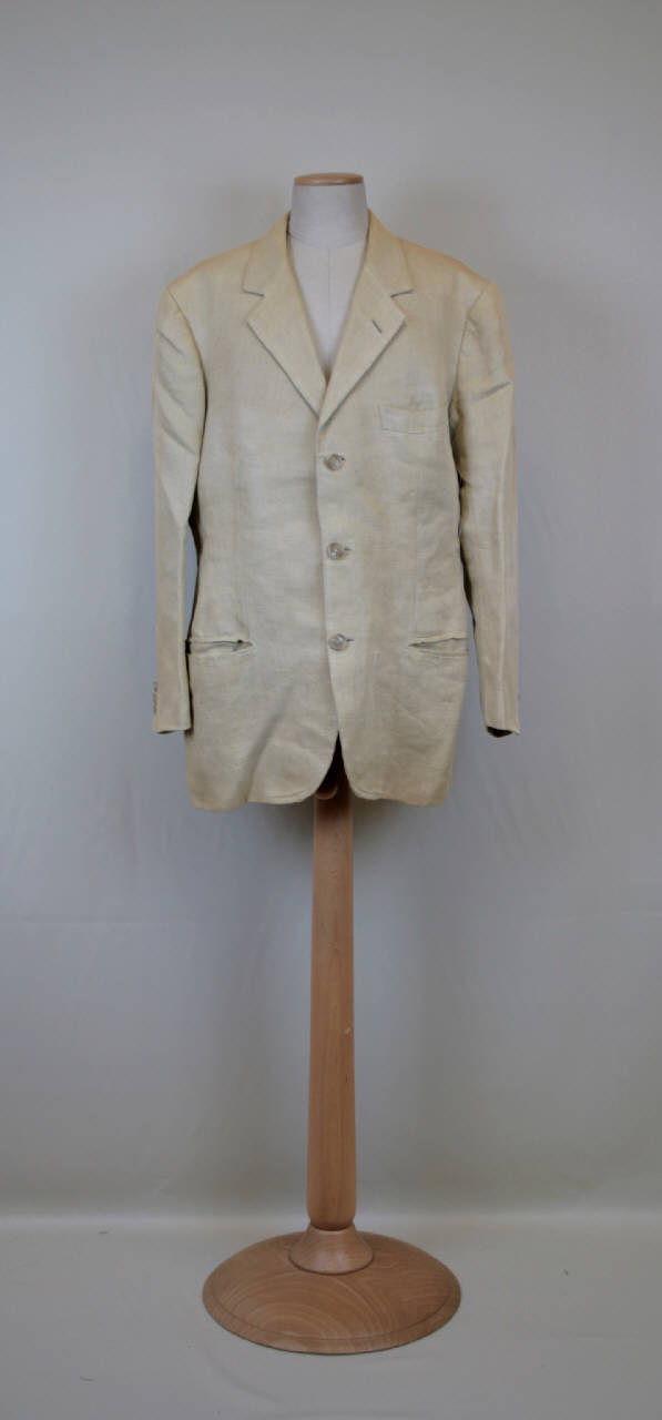 Completo composta da giacca e pantaloni in taffetas shantung color tortora. Giacca monopetto chiusa da 3 bottoni e 3 occhielli, collo a risvolti con occhiello, modellata da pinces. Due tasche a filetto e taschino con patta cucita; dorso con cucitura centrale e spacco. Maniche in due pezzi con spacco al fondo fermato da 3 bottoni e occhielli funzionali. Fodera in raso avorio con tasca interna con filetto e patta e spalle imbottite. Pantaloni classici alti in vita, con risvolto. Cintura e passanti, 2 pinces aperte per lato, tasche inserite nella cucitura dei fianchi; patta verticale a 4 bottoni nascosti e un gancio sulla cintura; sul dietro pinces chiuse e due tasche a filetto chiuse da bottone. Etichetta all'interno della giacca, con marchio del produttore e completata a mano "Mario Quarti - giugno 68".