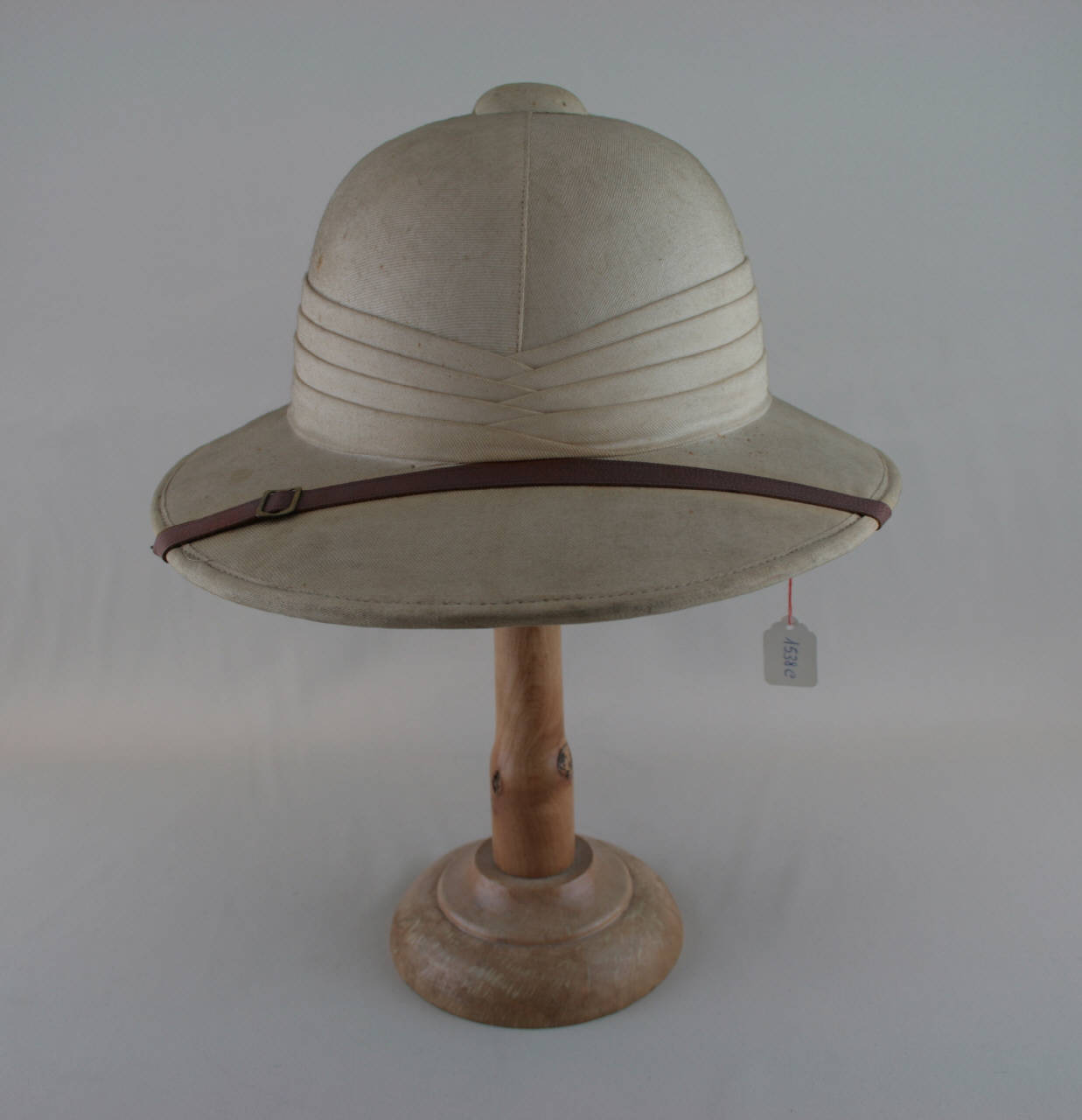 Casco coloniale con struttura in sughero, rivestito all'esterno da diagonale di cotone avorio chiaro. Cinta in tela (louisine) avorio decorata da pieghe incrociate sul davanti. Sottotesa rivestita in tela verde. Un cinturino in pelle marrone traversa la tesa sul davanti ed è fissato ai lati. All'interno un'etichetta in carta stampata con marchio del produttore; altra etichetta in carta dentellata con numero 6207 P.T.30; altra etichetta in carta rossa e oro con dicitura "Casque Insolaire Impermeable".