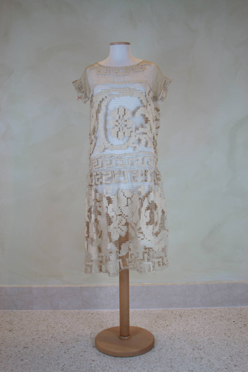 Abito a vita bassa, lungo al polpaccio, in rete color avorio a filet a grandi maglie ricamata a punto tela. Decoro a grandi girali che includono corolle, disposti orizzontalmente sul corpetto e gonna, inclusi in cornice a greca. Corpino in un pezzo, con cucitura sul fianco sinistro; scollo a barca e maniche cortissime aggiunte. Gonna in un pezzo, chiuso sul fianco sinistro; unita al corpino con leggera arricciatura. Il sottabito è mancante.