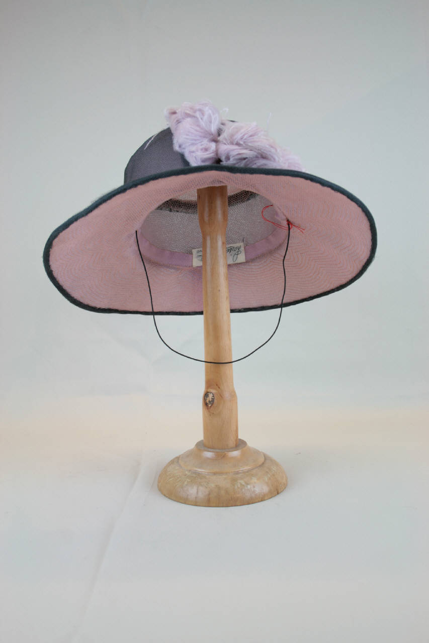 Cappello da cerimonia a tesa ampia in tulle rosa rigido a maglie larghe, ricoperto all'esterno da tulle rosa, nero e crespo nero. Calotta cilindrica, tesa circolare cucita alla calotta, decorata da impunture in filo rosa che descrivono smerli concentrici, velate dal crespo nero più esterno. Cinta in tulle nero con nodo e fiocchi di piume tinte in rosa applicati sul davanti. Giro d'entrata in nastro gros nero. All'interno etichetta in nastro operato.
