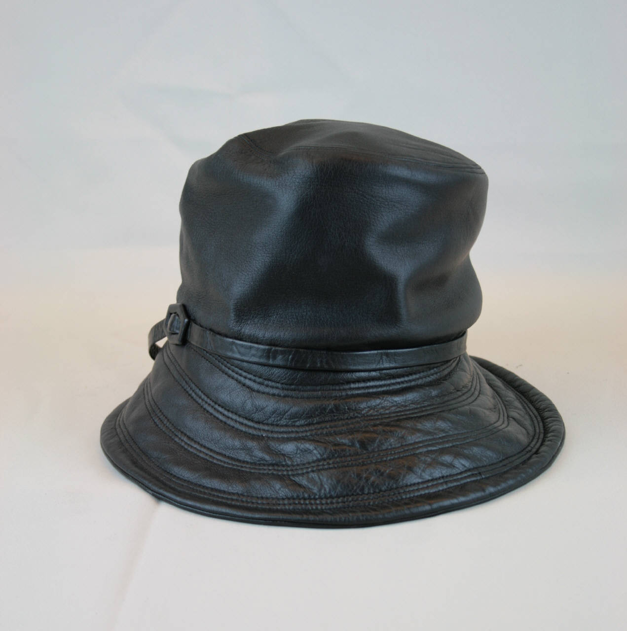 Cloche in pelle nera, con alta calotta cilindrica che scende a coprire la fronte, modellata al centro dietro da pieghe orizzontali. Tesa ovale più stretta sul dietro, decorata da impunture concentriche. Cinta sottile in pelle nera, con fibbia sul lato destro. Fodera in taffetas nero. Giro d'entrata in gros nero.