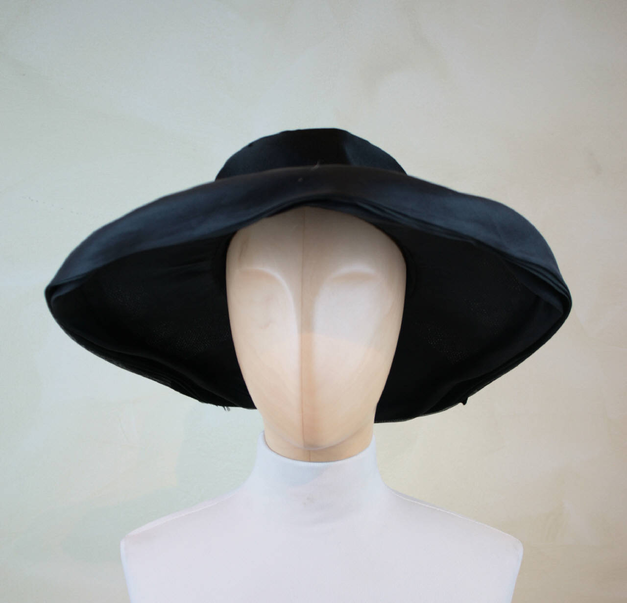 Cappellina con ampia tesa, in crespo nero. Calotta bassa a tamburo, con struttura in tulle rigido; tesa più stretta sul dietro e convessa, con sostegno in tulle doppio e ferrino lungo il bordo. Bordo profilato da banda di crespo con 4 pieghe. Cinta in alto nastro di raso nero annodato sul dietro, dove sostiene 2 rose in tessuto nero. All'interno etichetta in nastro operato; altra etichetta in nastro operato "Made in France"