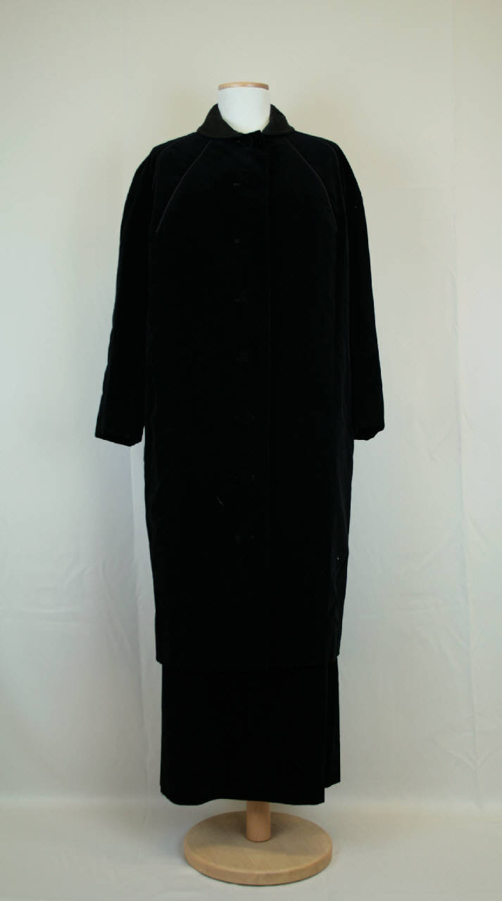Completo in velluto nero formato da soprabito a tre quarti e gonna lunga alla caviglia. Soprabito diritto, con davanti in 4 pezzi modellato allo scollo da tagli a raggiera con nervature in raso nero. Girocollo con collo semplice stondato in raso, apertura con 8 grandi bottoni rivestiti in velluto e occhielli corrispondenti. Dietro in 3 pezzi, con tagli analoghi al davanti. Maniche lunghe a raglan con tassello e pinces sulla linea della spalla. Fodera in raso nero. All'interno sotto lo scollo etichetta in nastro operato. Maxigonna con baschina sagomata in spicchi e cinturino. Davanti in un telo, dietro in tre teli con finte pieghe laterali che nascondono lo spacco centrale. Cerniera sul dietro, nella cucitura a sinistra del telo centrale. Fodera in taffetas nero.