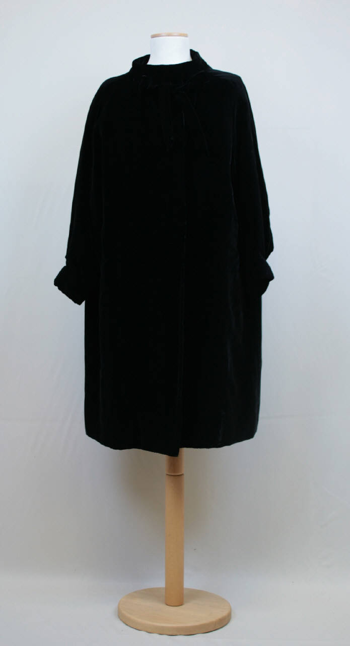 Soprabito lungo sotto il ginocchio, in velluto nero. Linea ampia e diritta, scollo rotondo e collo a cinturino. Apertura con sovrammettitura, chiusa al collo da 2 automatici e al punto vita da bottone interno. Fiocco decorativo dello stesso tessuto alla base del collo. Maniche ampie a raglan, strette al fondo da pieghe fermate da polsino. Fodera in raso nero. All'interno, sul fianco sinistro, etichetta in nastro stampato.