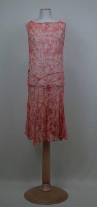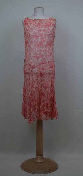 Abito senza maniche, a vita bassa, lungo al ginocchio, in crespo stampato avorio e rosa geranio con motivo a onde di ispirazione giapponese. Corpino con scollo a barca, che scende fino ai fianchi dove si unisce alla gonna a 7 teli sagomati ad archi che si sovrappongono l'uno all'altro nella parte alta. Sul fianco destro passante per cinturina (perduta). Sottabito mancante.