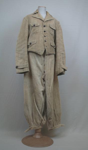 Completo formato da giacca e calzoni alla zuava in velluto a coste nocciola. Giacca corta sotto la vita con brevi falde a V; monopetto con collo a risvolti, chiusa da 5 bottoni (dei quali 1 mancante) e occhielli corrispondenti. Tasche e taschini con patta sagomata, chiusa da occhiello e bottone (1 perduto). Sui fianchi coppie di cinturini regolabili con fibbia. Dorso ampio in due pezzi, modellato da pinces. Maniche lunghe, con cinturino fermato da bottone al fondo. Calzoni alti in vita; cintura chiusa da bottone in metallo (marchio Mode de Paris) e gancio (marchio Solide Elegant) con passanti e bottoni per bretelle (1 perduto). Patta verticale a 5 bottoni nascosti; cinturini regolabili sui fianchi. Tasche verticali a filetto sui fianchi e tasca orizzontale a filetto sul dietro chiusa da bottone. Gambe molto ampie, arricciate al fondo e strette sotto il ginocchio da cinturino con fibbia. Nella giacca fodera in diagonale con tasca interna a sinistra. Nei calzoni fodera in tela nocciola.